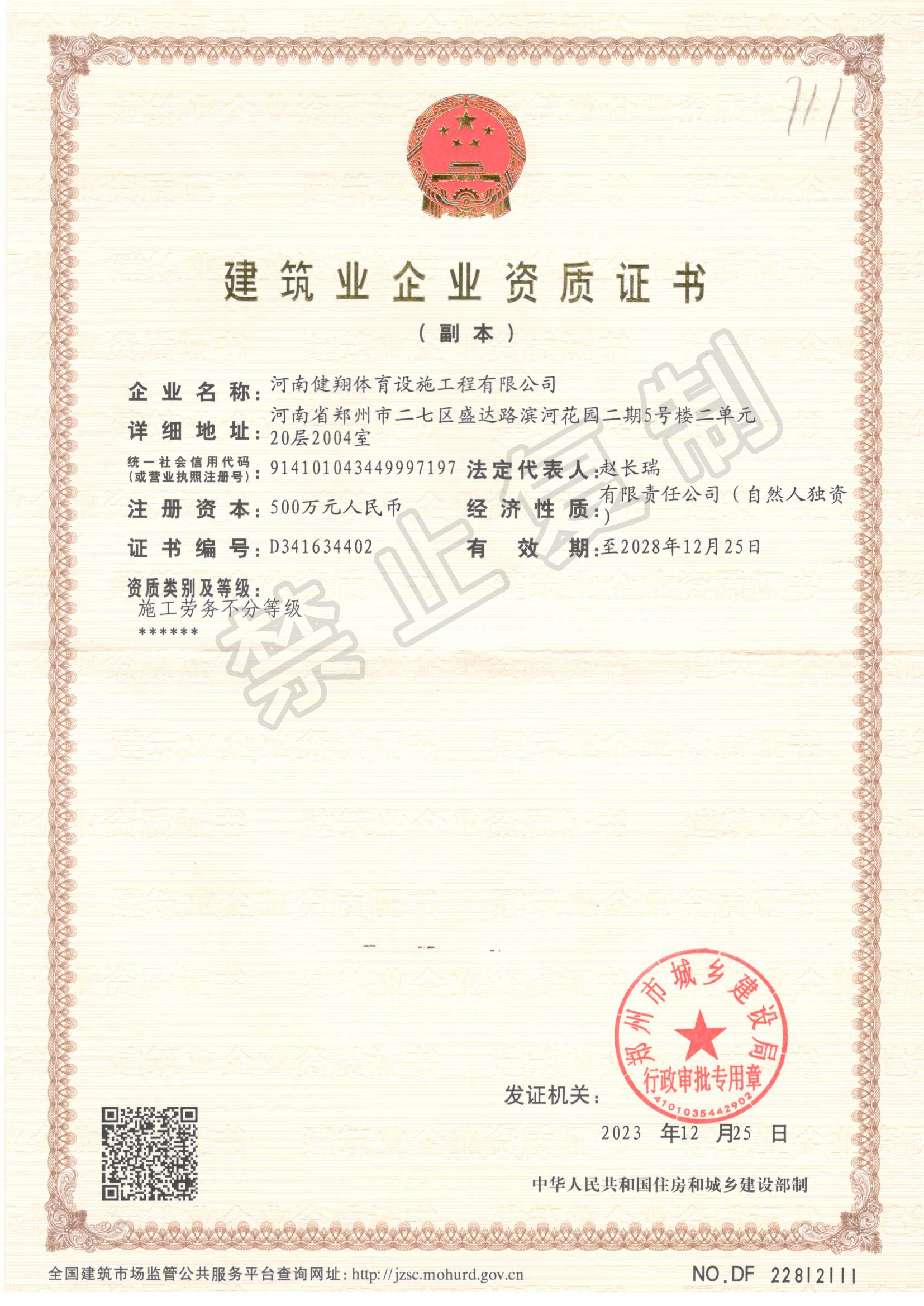 河南健翔體育設施工程有限公司是一家集生產、銷售、咨詢、設計、施工、維護于一體的專業體育運動場地施工工程有限公司,我們將“優質、高效、誠信、發展”作為公司一貫的經營理念。自公司成立以來,本著“誠信經營、客戶 ”的經營態度,以客戶為中心的經營思想,博得行業的贊譽,以及客戶的信賴。公司擁有一整套實用的獨特施工技術及施工設備、一批經驗豐富的專業施工團隊,在全國各地承攬的施工工程中多項通過中國田徑協會驗收、深得用戶好評和信賴,并取得了良好的社會效益!公司主要業務有:塑膠跑道工程、PVC塑膠地板工程、環氧樹脂地坪工程、幼兒園場地工程、體育器械設施工程、人造草坪工程、地板工程、硅PU球場工程、丙烯酸球場工程、圍網燈光工程等系列的體育場地及器材安裝和貿易等,為客戶提供新穎、優質、舒適的運動場地…… >>查看詳情